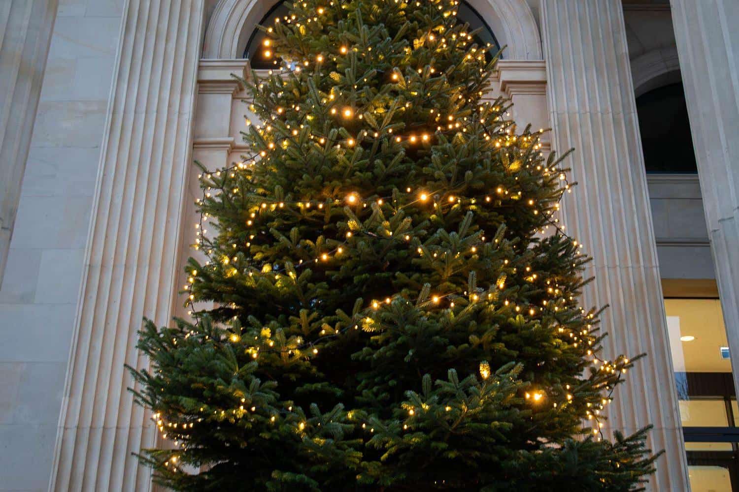 Seit heute ergänzt ein über acht Meter hoher Tannenbaum mit 180 Meter langer LED-Lichterkette den äußeren Eingangsbereich.