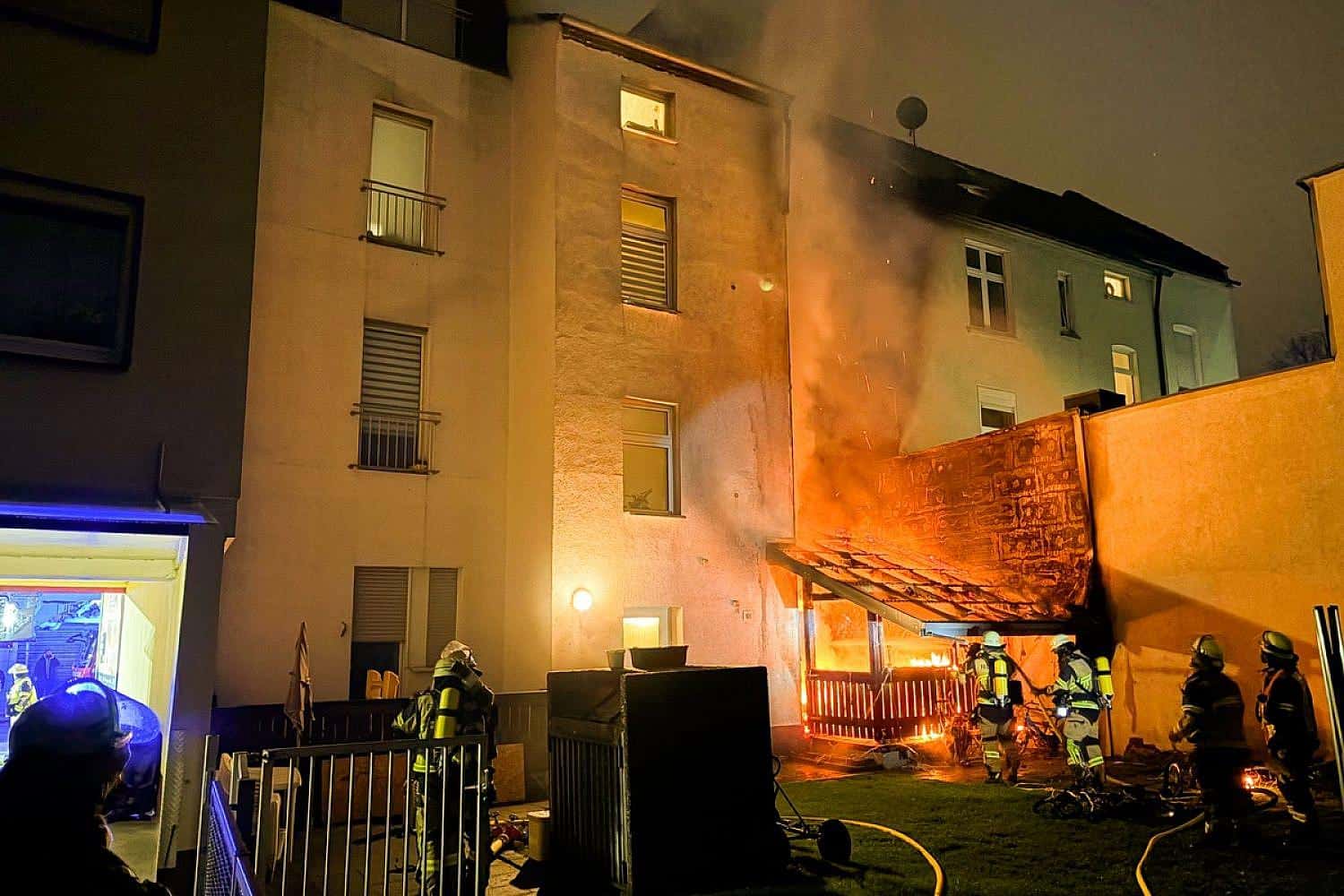 Essen () – In Essen-Altenessen ist in der Nacht ein Terrassenanbau in Brand geraten. Die Flammen breiteten sich an der Fassade bis unter das Dach eines Mehrfamilienhauses aus und griffen auf eine Küche im Erdgeschoss über, wie die Feuerwehr am Donnerstag mitteilte.