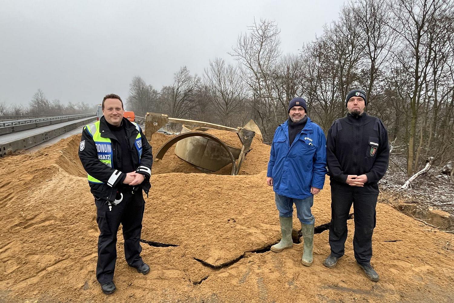 Johannes Brauns (Kommunale Ordnungsdienst Stadt Köln), Dirk Putzer (Einsatzleiter Kampfmittelbeseitigungsdienst Bezirksregierung Düsseldorf), Markus Schmitz (ebenfalls Kampfmittelbeseitigungsdienst) am Fundort des Blindgängers nach der Sprengung. , Tim Walther/ Stadt Köln via